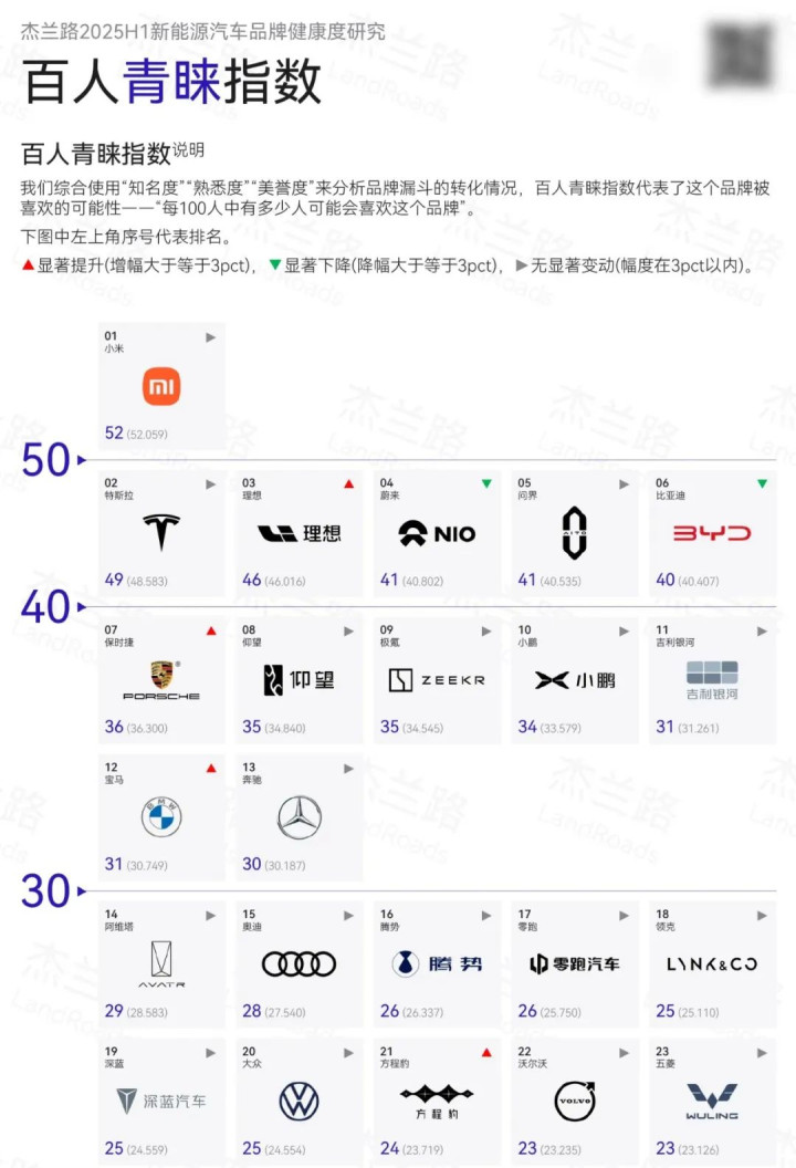 另外,阿维塔在2025年上半年的新能源汽车百人青睐指数榜单中排名第14位,每100人中约29人表示对这个品牌有好感。和阿维塔一起被分类到榜单第四方阵的品牌还有奥迪、腾势、零跑、领克以及长安深蓝等。